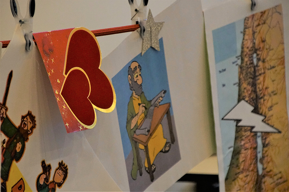 Den røde snor blev igen hængt op med billederne fra sidst og nye til denne dags fortællinger. Alle stjernerne blev også hængt op på snoren. De markerede Guds løfte om frelse for alle mennesker – et løfte som blev indfriet med Jesus i Det Nye Testamente.